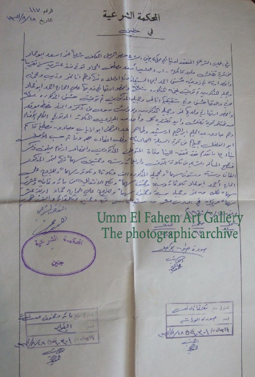 תצלום של בעלות קרקע מבית הדין השרעי בג'נין, 1971. מקור: מביתו של חאג' אחמד עלי אבו בכר סאלם.