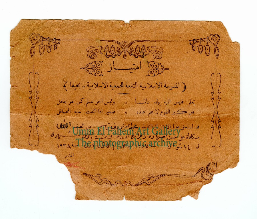 1st grade honors certificate for Mr. Abdullah Yusef Qassem Abu Hassan, Haifa, 1938. Source: Haj Abdullah Abu Hassan.