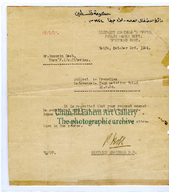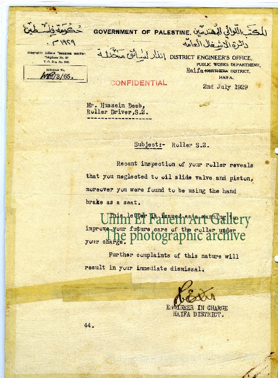 Warning document for negligence in working with a machine, 1924. Source: Beit Talat Mahajana - Mosmus.