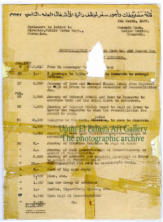 עותק מסמך של רשימת הוצאות נסיעה ושכר לעובד אגף לעבודות ציבוריות, נצרת, 1937. מקור: מבית טלעת מחאג'נה - מוסמוס.
