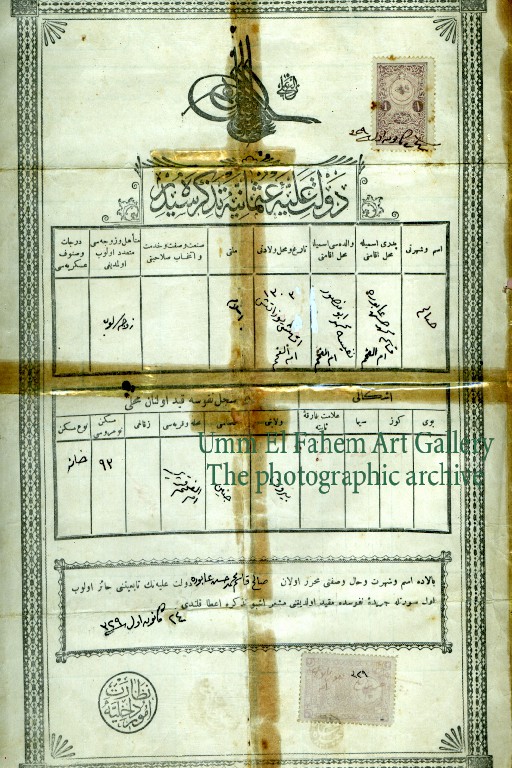 Birth certificate from the period of the Ottoman Empire for the newborn Saleh Qassem Muhammad Abura - Umm el Fahem, 1908. Source: unknown.
