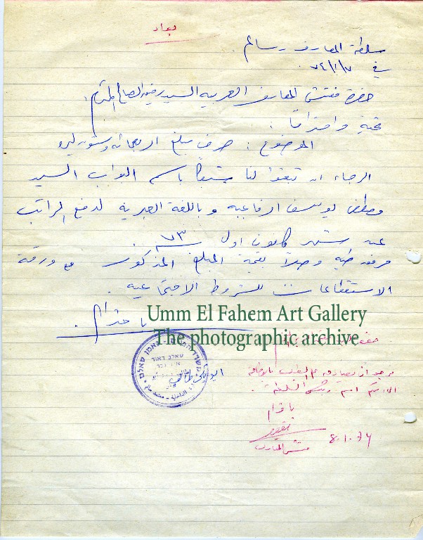 מכתב ממוכתר סאלם למפקח החינוך, ראפיק סאלח, לתשלום שכר טרחה לאב הבית, 1974. מקור: טאליב דאוד אבו בכר.